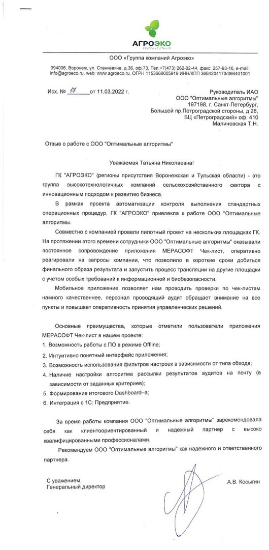 Совместно с компанией провели пилотный проект на нескольких площадках ГК. На протяжении этого времени сотрудники ООО "Оптимальные алгоритмы" оказывали постоянное сопровождение приложения МЕРАСОФТ Чек-лист, оперативно реагировали на запросы компании, что позволило в короткие сроки добиться финального образа результата и запустить процесс трансляции на другие площадки с учетом особых требований к информационной биобезопасности.