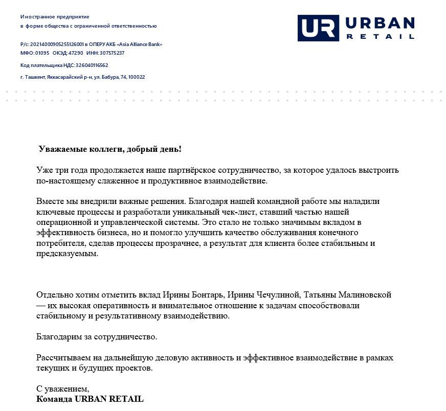 Результат: "... Вместе мы внедрили важные решения. Благодаря нашей командной работе мы наладили ключевые процессы и разработали уникальный чек-лист, ставший частью нашей операционной и управленческой системы. Это стало не только значимым вкладом в эффективность бизнеса, но и помогло улучшить качество обслуживания конечного потребителя, сделав процессы прозрачнее, а результат для клиента более стабильным и предсказуемым.