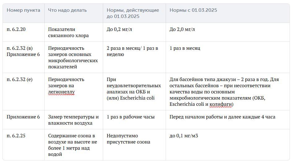 - Увеличение частоты контроля температурного режима и влажности: Температурные показатели и влажность воздуха в бассейне требуется проверять каждые 4 часа и перед открытием объекта (ранее - один раз в день).